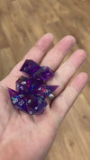 🎲 Each die is crafted from a violet purple transparent acrylic, infused with a lightning-like holographic foil, and finished with silvery numbers for a distinctly Gale-like look.